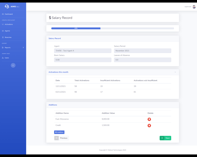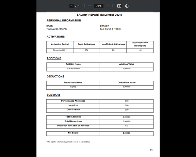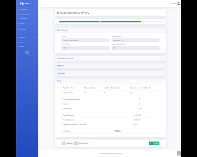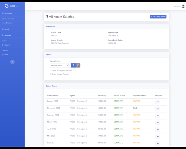 This software allows sales team leads to manage their agents' information and track their metrics.The software will then use the company's remuneration structure and other variable parameters to calculate their salaries, commissions and bonuses including deductions, penalties and leave allowances. Once processing has completed, the software will generate a salary record with the amount payable. The agents are able to self-serve this information using their own dashboard.