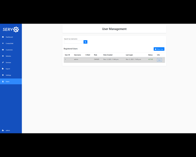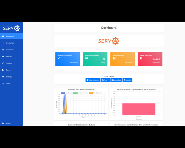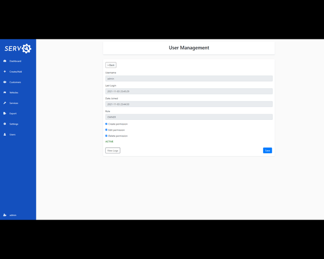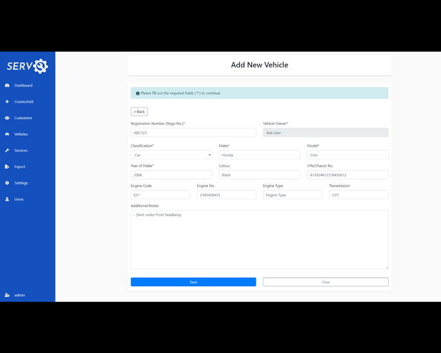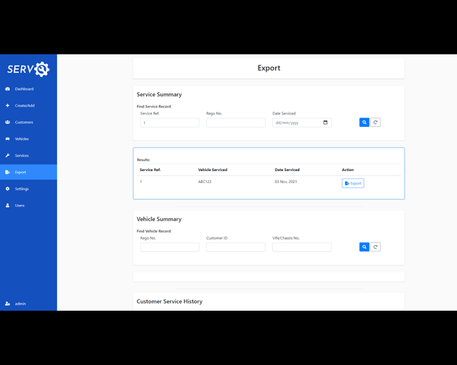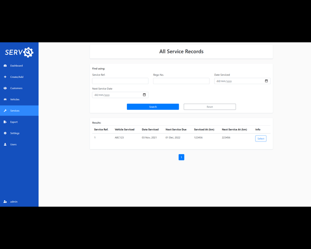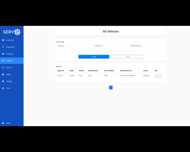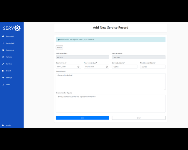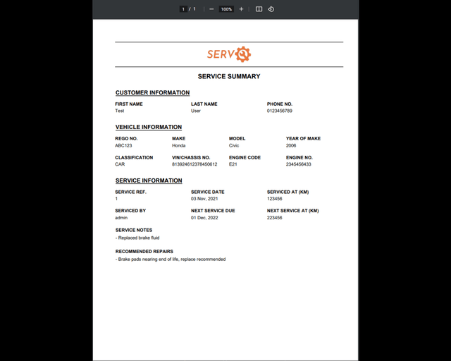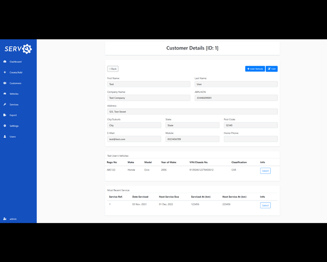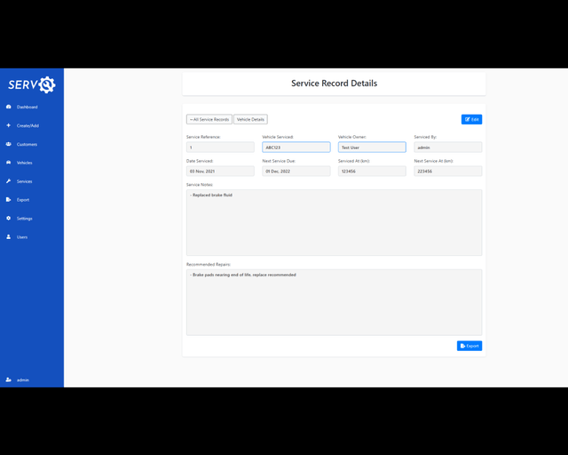 A cloud-hosted web app which allows the user to keep track of the customer's information, a record of the key vehicle information and a record of each service that is performed by the mechanic. The application also provides some quality of life improvements such as generating customised reports for things like vehicles/services/service history, backup and export, automatic backups and audit logs.